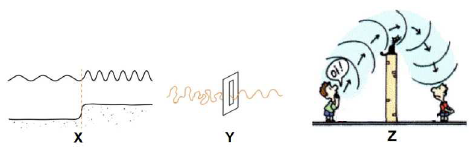 Os fenômenos ondulatórios destacados em X, Y e Z, respectivamente, são: