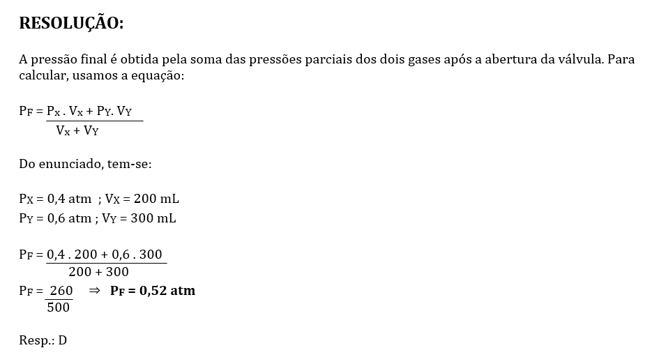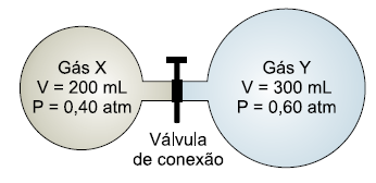 Considerando a temperatura constante e o volume da válvula desprezível, a pressão final da mistura dos gases X e Y, após a abertura da válvula, será de