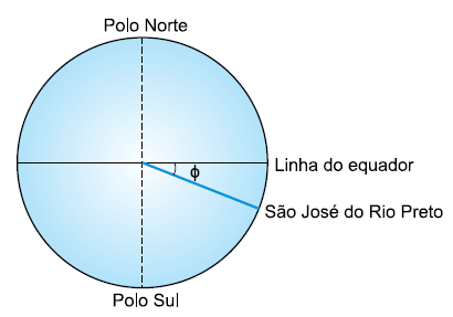 Em São José do Rio Preto (ϕ = 21º Sul) , a pessoa não está girando no equador, mas em um círculo “menor” mais ao sul. A distância desse ponto até o eixo de rotação da Terra é menor.Olhando para a geometria (trigonometria), o raio de rotação nessa latitude (r) é a projeção do raio da Terra no plano horizontal daquela latitude: