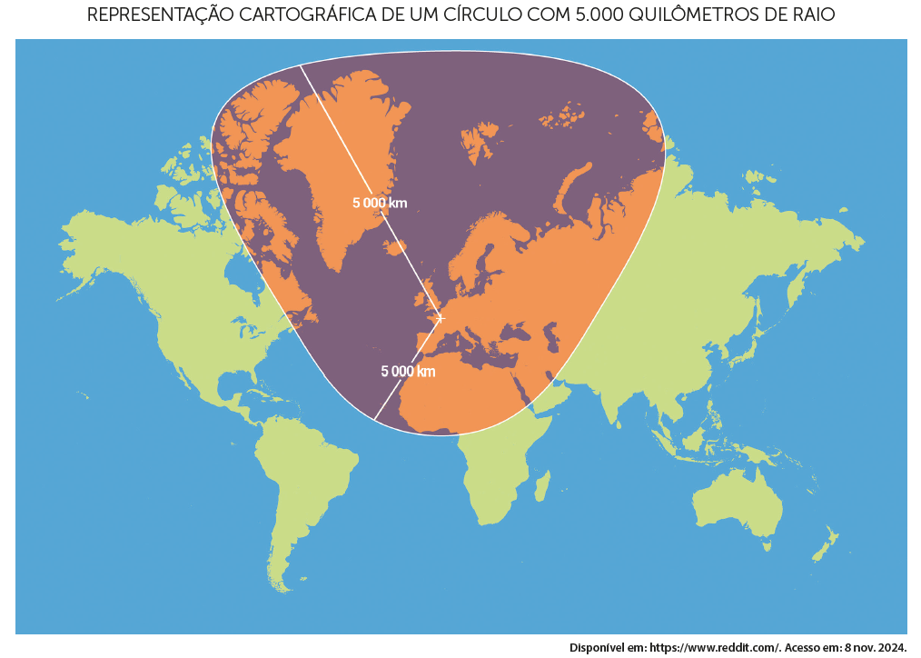 A imagem mostra um mapa-múndi onde a forma que deveria ser um círculo perfeito (um raio de 5.000 km a partir de um ponto central na Europa) aparece extremamente distorcida. Na parte sul do círculo a linha é curva e relativamente proporcional.