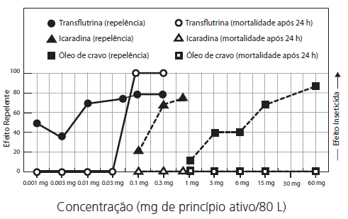 A) a transflutrina, a icaridina e o óleo de cravo têm ação repelente, mas não ação inseticida.