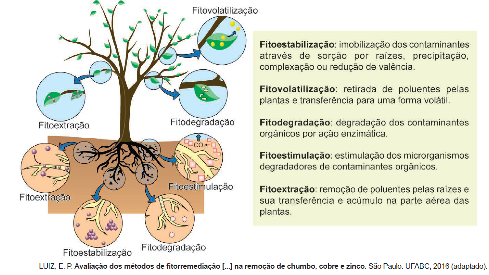 (Enem/2024) A fitorremediação é uma técnica que utiliza plantas para a remediação de ambientes contaminados. A descontaminação de solos pode ocorrer por descarte, absorção e metabolização, imobilização, extração ou volatilização do poluente, conforme representado na figura.