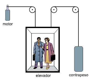 (Uni-Facef/2015) A figura mostra um motor que aciona um elevador cuja massa, juntamente com a dos passageiros, é de 900 kg. O contrapeso possui massa 600 kg e a aceleração da gravidade no local vale 10 m/s2.