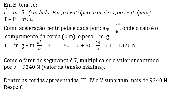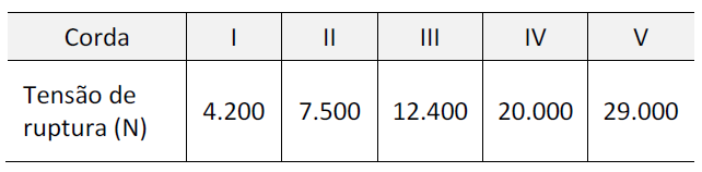 diversões exige que a corda do brinquedo tenha um comprimento de 2,0 m. O projetista tem que escolher a corda adequada para o balanço, a partir de cinco ofertas disponíveis no mercado, cada uma delas com distintas tensões de ruptura.