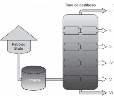 E) I – Gás; II – Gasolina; III – Querosene; IV – Óleo lubrificante; V – Óleo diesel; VI – Resíduo.