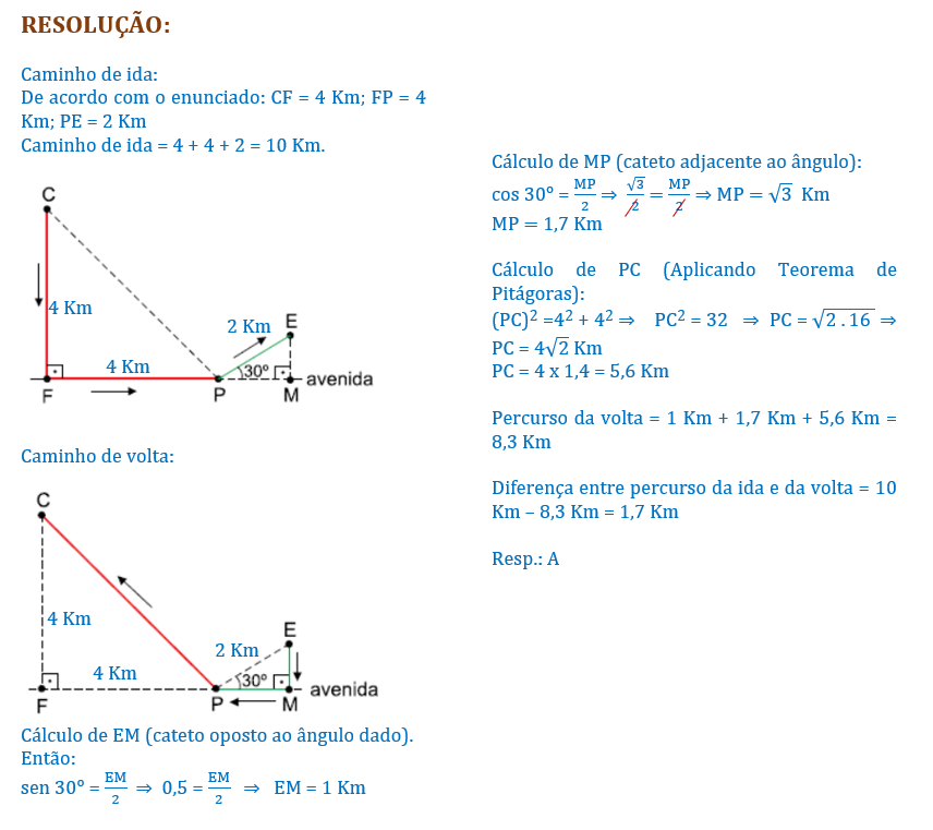 Os caminhos de ida e de volta são formados por segmentos de retas, sendo que a farmácia, a padaria e o mercado estão em uma mesma avenida reta e plana. Considerando CF = FP = 4 km, PE = 2 km, √2 = 1,4 e √3 = 1,7, o caminho de Laura de casa à escola na ida superou o de volta em