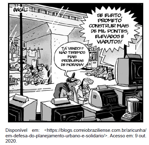 A charge deixa claro o interesse do poder público em priorizar grandes obras que atendem mais às classes mais ricas, ao invés de investir em moradias populares.