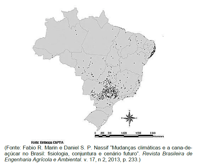 A figura acima indica a distribuição de usinas sucroenergéticas no Brasil em 2010. Essas usinas provocaram aumento da produção de vinhaça, resíduo pastoso e malcheiroso resultante da destilação do caldo de cana-de-açúcar fermentado.