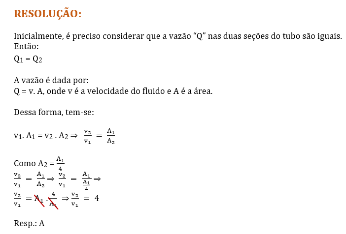 (UFRGS/2017) A figura abaixo mostra um fluido incompressível que escoa com velocidade v1 através de um tubo horizontal de seção reta A1 e atravessa, com velocidade v2, um trecho estrangulado de seção reta A2 = A1/4.