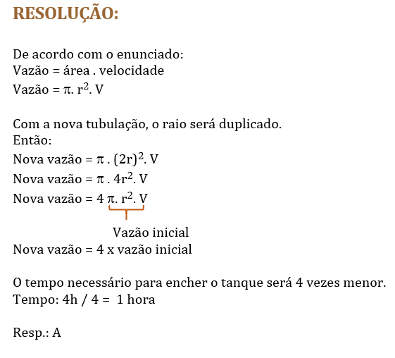(Enem/2014 – PPL) A vazão de água (em m3/h) em tubulações pode ser medida pelo produto da área da seção transversal por onde passa a água (em m2 ) pela velocidade da água (em m/h). Uma companhia de saneamento abastece uma indústria utilizando uma tubulação cilíndrica de raio r, cuja vazão da água enche um reservatório em 4 horas. Para se adaptar às novas normas técnicas, a companhia deve duplicar o raio da tubulação, mantendo a velocidade da água e mesmo material.