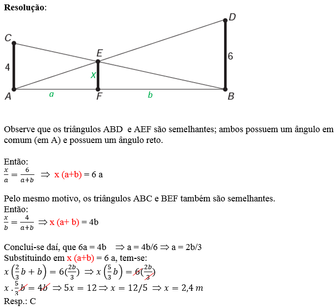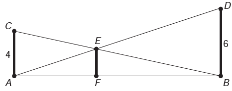 (Enem/2013) O dono de um sítio pretende colocar uma haste de sustentação para melhor firmar dois postes de comprimentos iguais a 6 m e 4 m. A figura representa a situação real na qual os postes são descritos pelos segmentos AC e BD e a haste é representada pelo segmento EF, todos perpendiculares ao solo, que é indicado pelo segmento de reta AB. Os segmentos AD e BC representam cabos de aço que serão instalados.