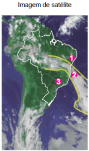 01) Considerando conhecimentos sobre a dinâmica atmosférica, é correto afirmar que os números 1, 2 e 3 na imagem de satélite correspondem, respectivamente, a