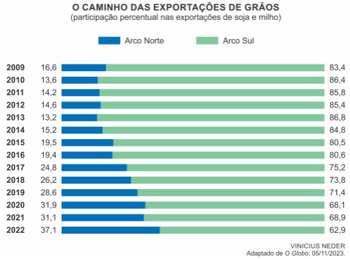 (Uerj 2025) Agravada este ano pelo fenômeno El Niño, a seca sazonal da Amazônia, que levou os rios ao menores níveis da história, atrapalha o transporte de pessoas e mercadorias num momento em que os portos das regiões Norte e Nordeste, que formam o chamado Arco Norte, respondem por mais de 37% das exportações de soja e milho, principais itens da safra nacional de grãos. Nos últimos dez anos, essa rota de escoamento mais do que duplicou sua participação na logística nacional. Os portos das regiões Sudeste e Sul formam o Arco Sul, sendo o Porto de Santos (SP) ainda a principal porta de saída de grãos. Mas a tendência é que a via no norte do país siga ganhando importância porque, quanto mais acima do paralelo 16° Sul estiver a mercadoria, mais vale a pena exportar pelo Arco Norte.