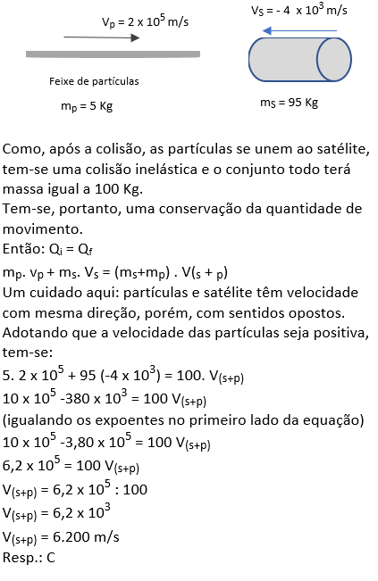 Considere que, em uma erupção solar em particular, um conjunto de partículas de massa total mp = 5 kg, deslocando-se com velocidade de módulo vp = 2×105 m/s, choca-se com um satélite de massa Ms = 95 kg que se desloca com velocidade de módulo igual a Vs = 4×103 m/s na mesma direção e em sentido contrário ao das partículas. Se a massa de partículas adere ao satélite após a colisão, o módulo da velocidade final do conjunto será de