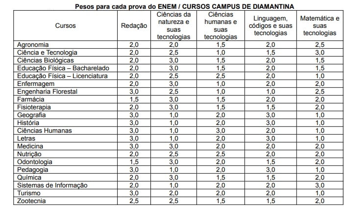 Para a composição da nota da 3ª etapa, serão utilizados os pesos estabelecidos pela instituição para cada uma das provas do Enem 2019: