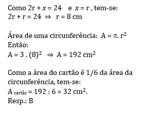 A medida do contorno do cartão, dada pela soma entre os dois segmentos de reta e o arco de circunferência, deve ser igual a 24 cm, para que seja possível um texto propaganda com todos os sabores das pizzas. Qual deve ser a medida da área, em cm2 , desse cartão de visita? Considere π= 3