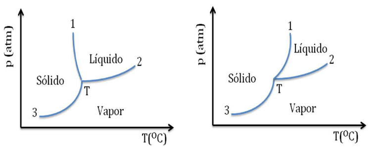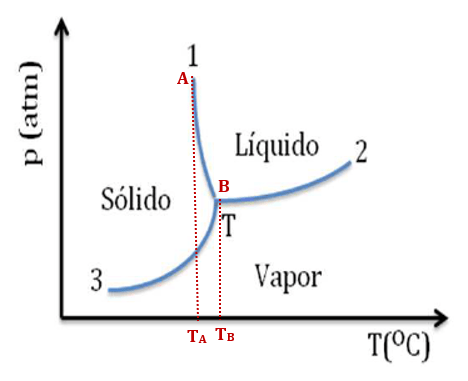 O ponto indicado por T recebe o nome de ponto triplo; ele indica o valor da temperatura e da pressão em que a substância é encontrada no estado sólido, líquido e gasoso ao mesmo tempo.