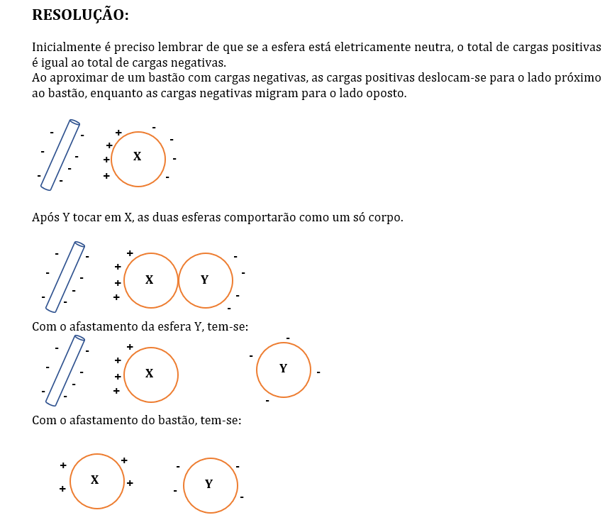 Com o bastão carregado ainda próximo de X, a esfera Y é afastada de X e, em seguida, o bastão é afastado de ambas cessando a ação do seu campo elétrico. Assinale corretamente a alternativa que indica, respectivamente, as cargas das