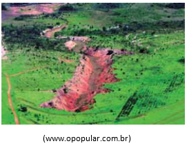 (UFSCar/2015) A figura mostra uma voçoroca localizada no alto da bacia do rio Araguaia, no estado de Goiás.