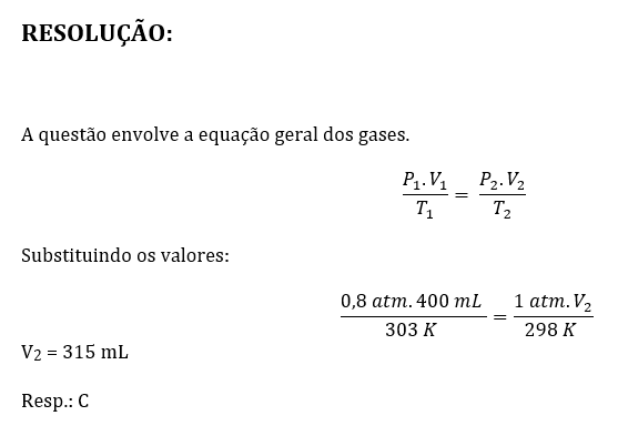 (ITA/2025) O volume de 400 mL de ar foi recolhido em um recipiente hermético, a bordo de um avião em voo, à pressão interna de 0,8 atm e 30 °C. Após o pouso, o ar foi transferido para um instrumento de medição em solo em condições ambiente. Assinale a alternativa que apresenta aproximadamente o volume de ar, em mL, medido pelo instrumento em solo.