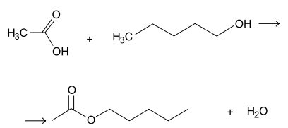 Na equação acima, o primeiro reagente é um ácido carboxílico (ácido etanóico) e o segundo reagente é um álcool primário (Pentan-1-ol), com formação de etanoato de pentila, um éster, além de água.
