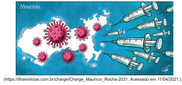 A charge faz uma referência à vacina contra o Sars-Cov-2, vírus causador da Covid-19.