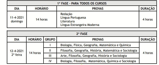 Com a alteração, a realização das provas será nos dias 11 e 12 de abril de 2021, a partir das 14 horas, em duas fases. Veja abaixo a distribuição por fases e grupos: